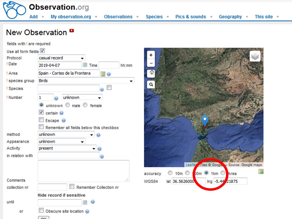 | Opción disponible en la web de Observado para elegir una precisión de la observación que dificulta su localización concreta. |