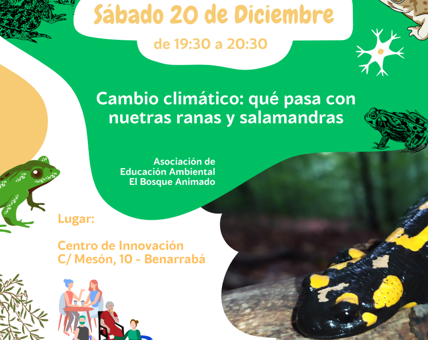 Continuamos con nuestra serie de charlas, en esta ocasión para conocer un poco más los anfibios que habitan en nuestro entorno. Hablaremos de esos pequeños seres delicados que habitan cerca de nuestras fuentes y puntos de agua y que nos alegran con su canto y sus saltos al agua. Aprenderemos a reconocer las especies más abundantes y descubriremos algunas curiosidades sobre la salamandra. Relacionaremos el cambio climático con la situación de estos animales tan sensibles a las temperaturas y la humedad.