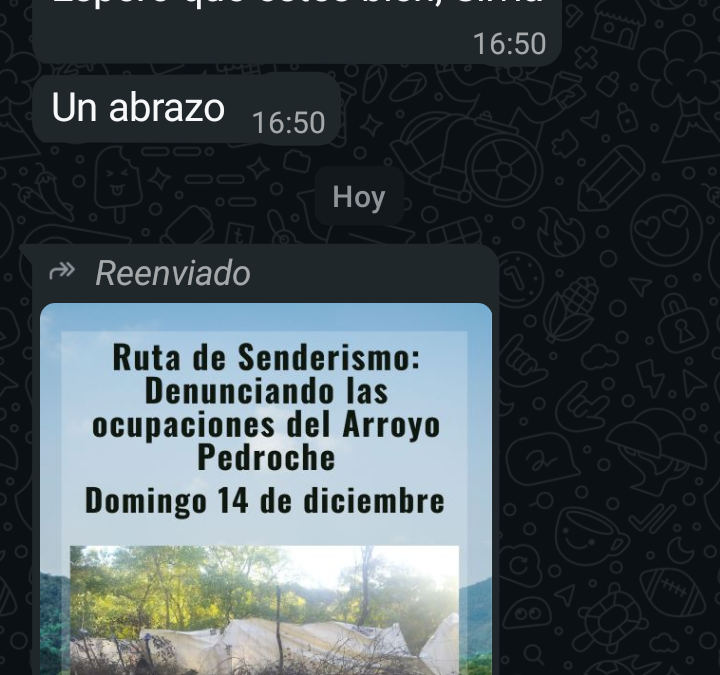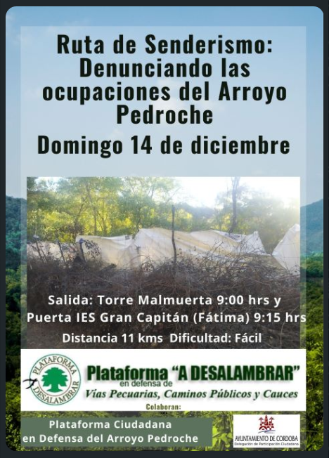 La Plataforma Ciudadana en Defensa del arroyo Pedroche constituida por la Plataforma a desalambrar, Ecologistas en Acción, Acisgru, Asociación vecinal Amanecer de Fátima, la Sociedad Cordobesa de Historia Natural y la Asociación de Educación Ambiental El Bosque Animado, darán a conocer la la ciudadanía las ocupaciones y el deterioro que sufre parte del cauce de este arroyo.